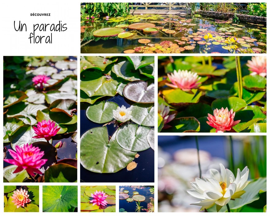 Ce sont plus de 300 plantes du monde entier qui égayent avec harmonie les différents jardins, bassins, pergolas, ruisseaux, cascades, labyrinthe qui composent la richesse des lieux. On peut y observer 30 variétés de Lotus, 150 sortes de Nymphéas, dont certaines très rares sous nos latitudes, ainsi que des dizaines de plantes aquatiques de berge. La serre expérimentale permet de découvrir un nénuphar tropical géant d’Amérique du Sud, le Cruziana !