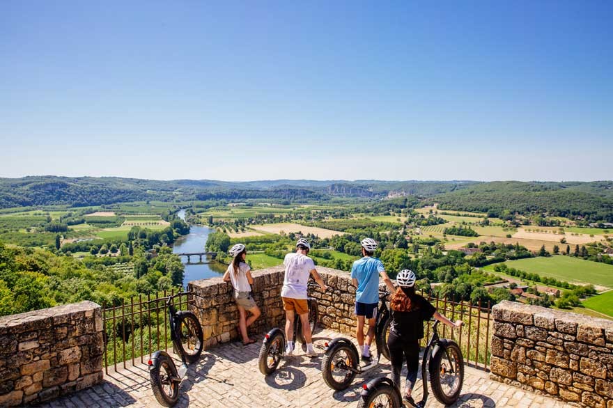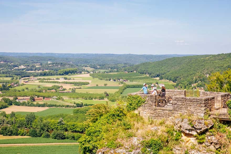 On débute par une découverte de la bastide de Domme, perchée sur son promontoire. Nous arpentons gentiment les ruelles magiques de ce lieu d’antan pour nous acclimater à notre véhicule écolo tracté uniquement à la force des mollets ! Nos véhicules piquent la curiosité des passants lorsque nous gagnons l’esplanade du village. Quelle vue sublime depuis ce balcon sur la Dordogne…
