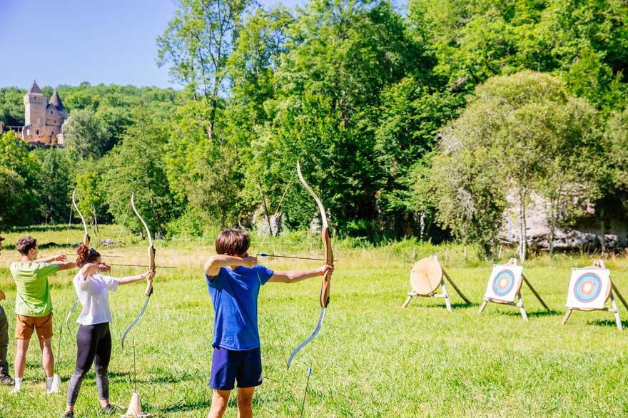 On lance la journée avec une séance de tir à l’arc dans le pré devant les ruines aménagées du château. On se rend compte rapidement que tous n’ont pas l’instinct de chasseur-cueilleur qui peut sommeiller en nous.